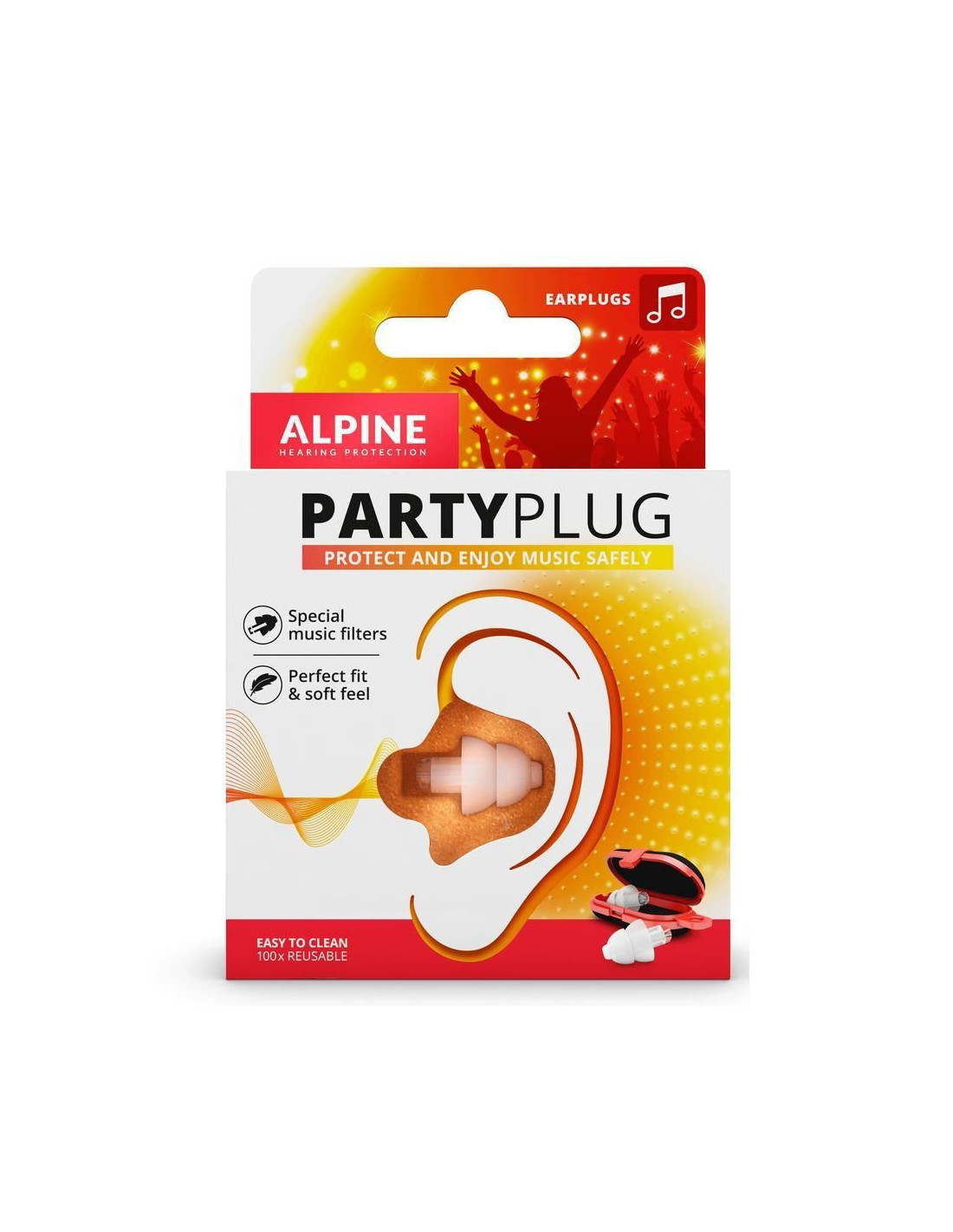 Cuando asistes a un concierto o festival, deseas disfrutar de la música sin sufrir pérdida auditiva. Los tapones para los oídos Alpine PartyPlug están diseñados específicamente para reducir el volumen de la música a niveles seguros, al mismo tiempo que te permiten disfrutar de una alta calidad de sonido y comunicación con amigos. Los tapones para los oídos PartyPlug se pueden usar todo el día (o toda la noche). El material termoplástico suave y flexible significa que el tapón para los oídos se moldea a tu canal auditivo. Además, el material es hipoalergénico y libre de siliconas.