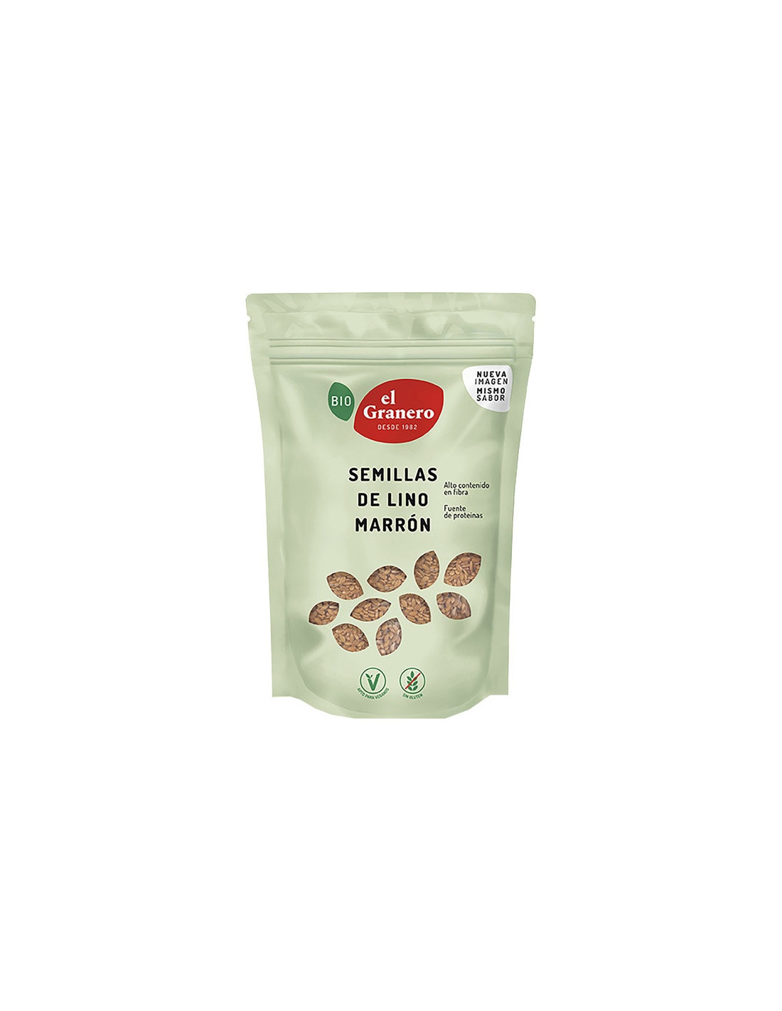 Semillas de lino marrón de cultivo ecológico. Proporcionan un elevado aporte de proteínas. El lino marrón es fuente de Omega 3 vegetal, por lo que está recomendado para las personas con una dieta sin pescado azul, por ejemplo personas veganas. El omega-3 reduce el colesterol malo y los triglicéridos en sangre, controla la presión arterial, mejora la circulación y protege el corazón. Además es fuente de fibra y de proteínas vegetales. También destacan por su contenido en vitaminas A y E. No contienen gluten, por lo que son adecuadas para personas celiacas. Sin huevo, lactosa ni azúcar.